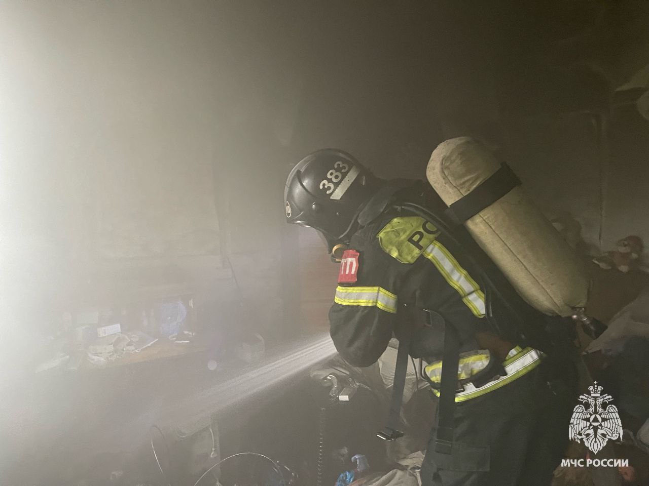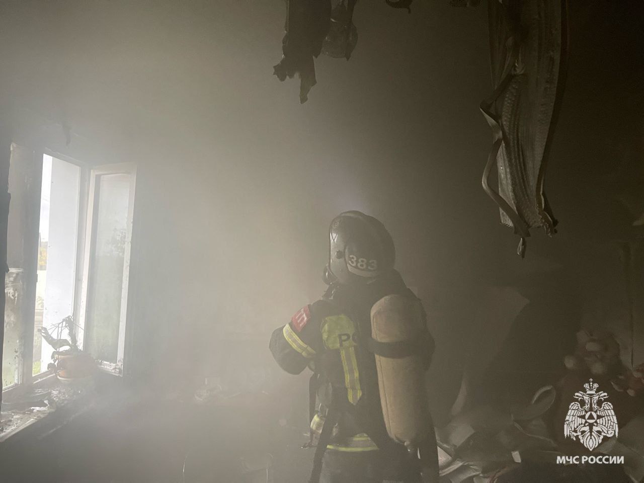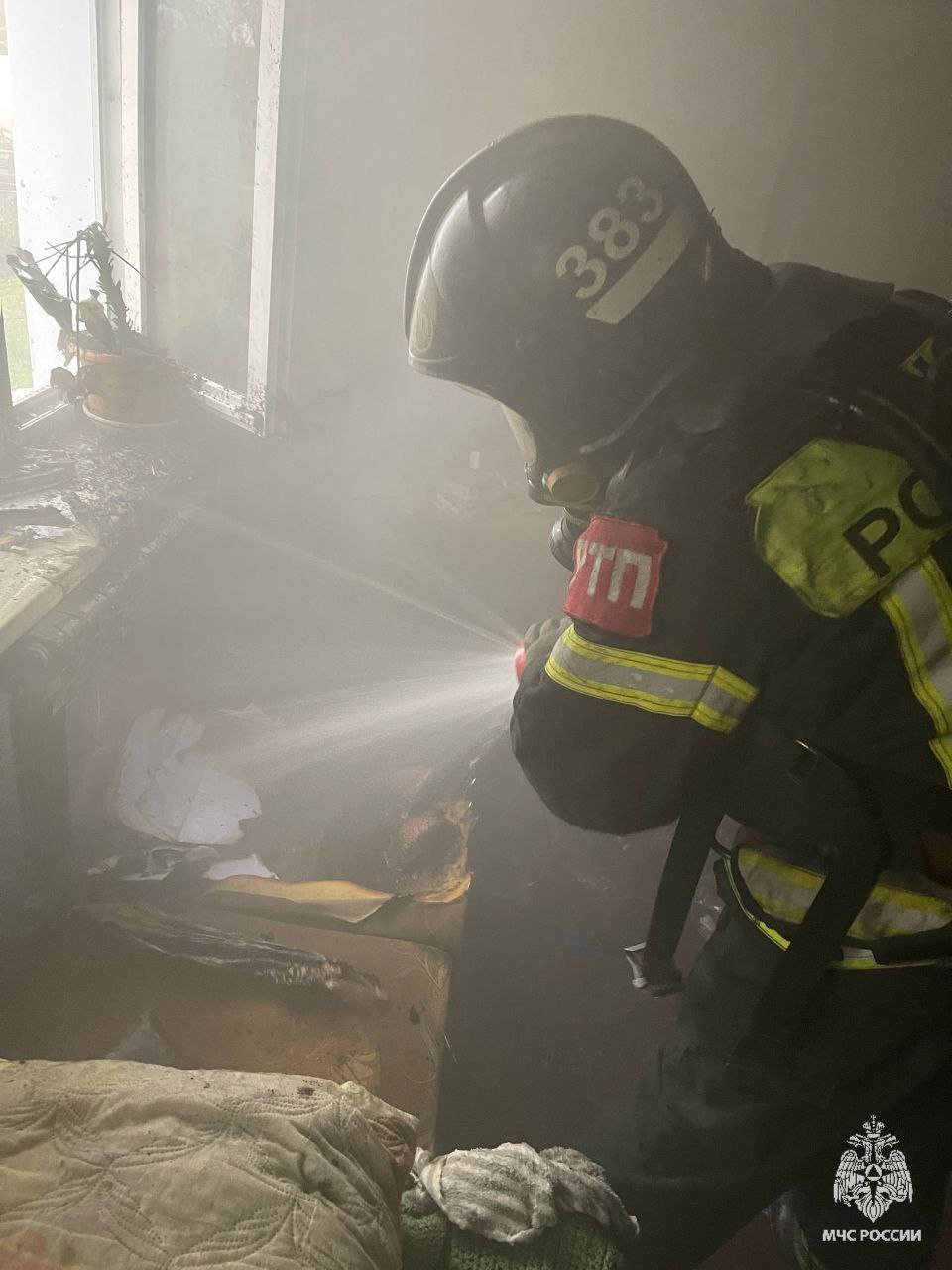На момент прибытия пожарных подразделений из окна квартиры шел густой черный дым. В результате пожара в одной из комнат выгорел телевизор, имеются термические повреждения холодильника и предметов интерьера.