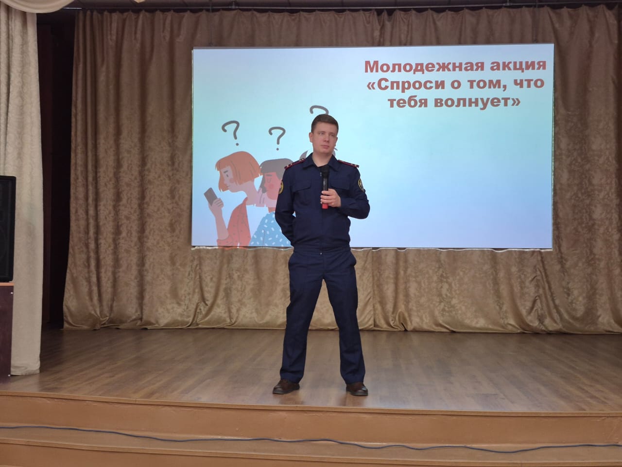 Сотрудник аппарата СУ СК России по Орловской области Артем Вышинский продолжил участие в акции «Спроси о том, что тебя волнует», проведенной в БПОУ ОО "Орловский техникум технологий и предпринимательства имени В.А. Русанова". Мероприятие было направлено на предупреждение экстремизма и терроризма, а также профилактику мошенничества.