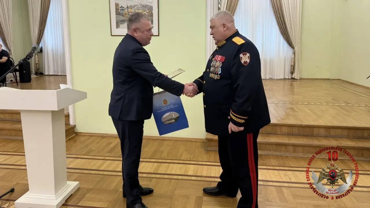 Во Владимире памятное мероприятие собрало ветеранов боевых действий, представителей законодательной и исполнительной власти, а также молодежных активистов. За добросовестный труд и значительный вклад в патриотическое воспитание подрастающего поколения заместитель председателя Законодательного собрания Владимирской области Дмитрий Рожков вручил начальнику областного Управления Росгвардии генерал-майору полиции Андрею Медведеву почетную грамоту регионального парламента.