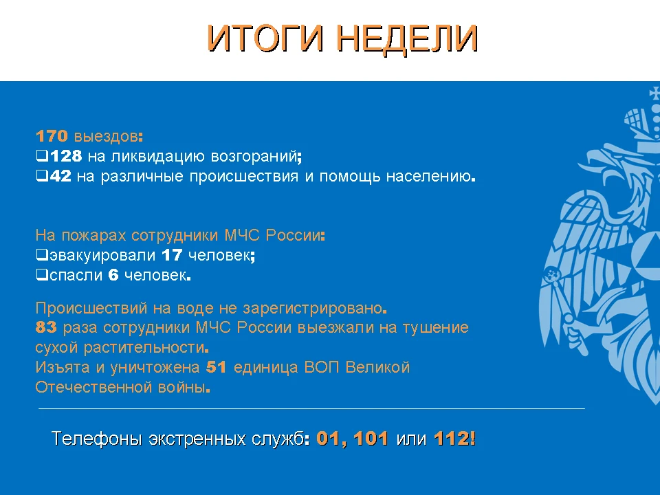 За прошедшую неделю сотрудники МЧС России Орловской области выезжали 170 раз: