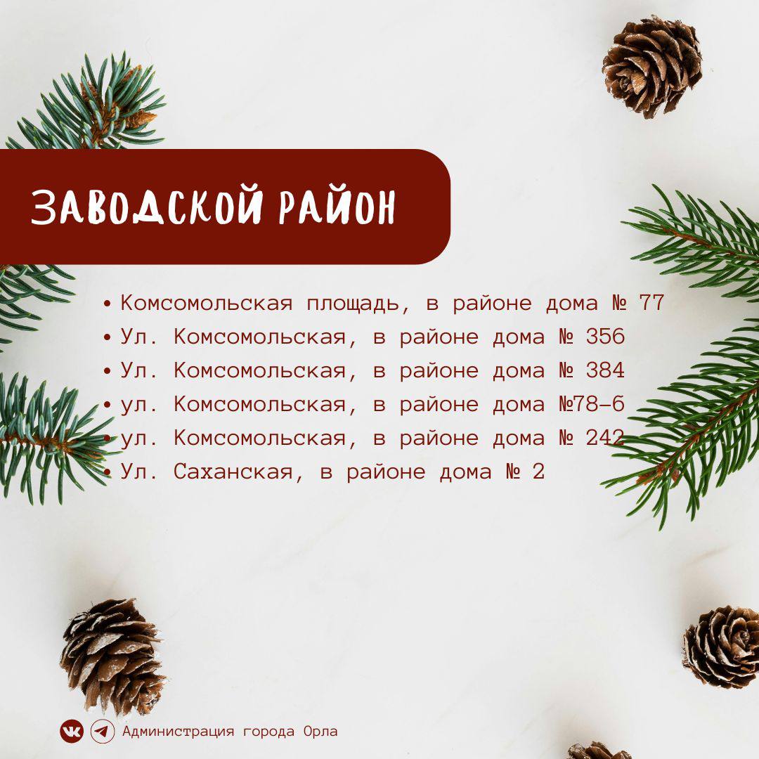 С 15 по 20 декабря в областном центре начнут работу ёлочные базары, которые будут открыты вплоть до 31 декабря. На 13 торговых площадках, расположенных во всех четырёх районах Орла, можно будет приобрести пихты, ели, сосны и лапник. Стоимость праздничных деревьев начнётся от 1 000 рублей за метр.