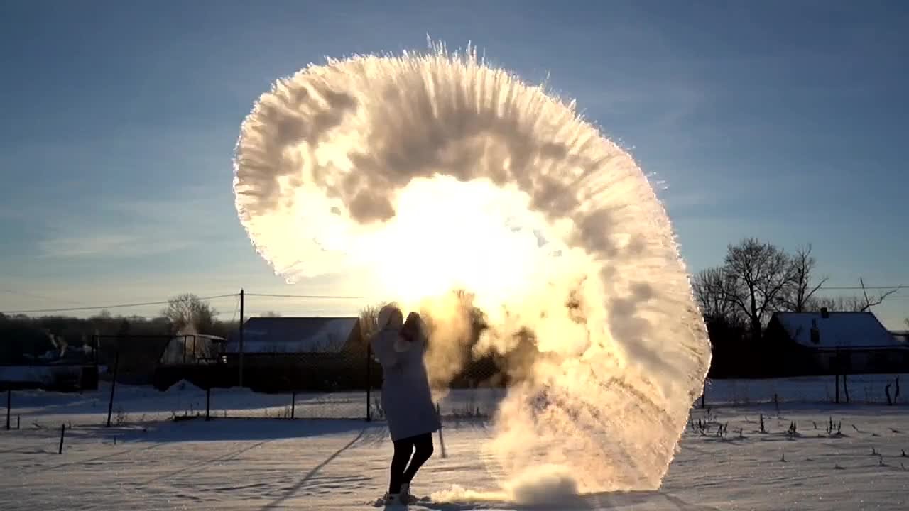Людмила Ревякина выложила видео на своей странице. Девушка взяла емкость с кипятком и разлила его при температуре около -25. При таком способе горячая вода моментально замерзает и превращается в пар