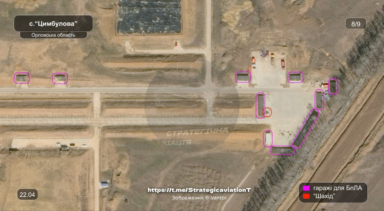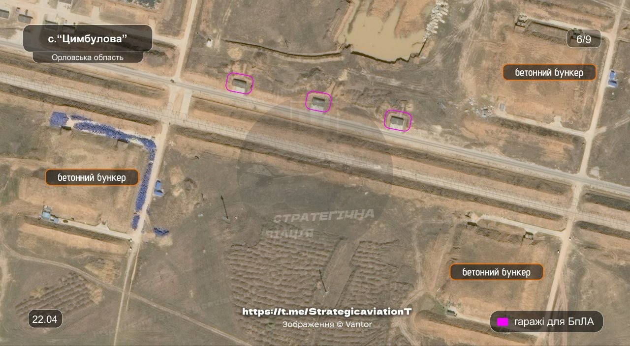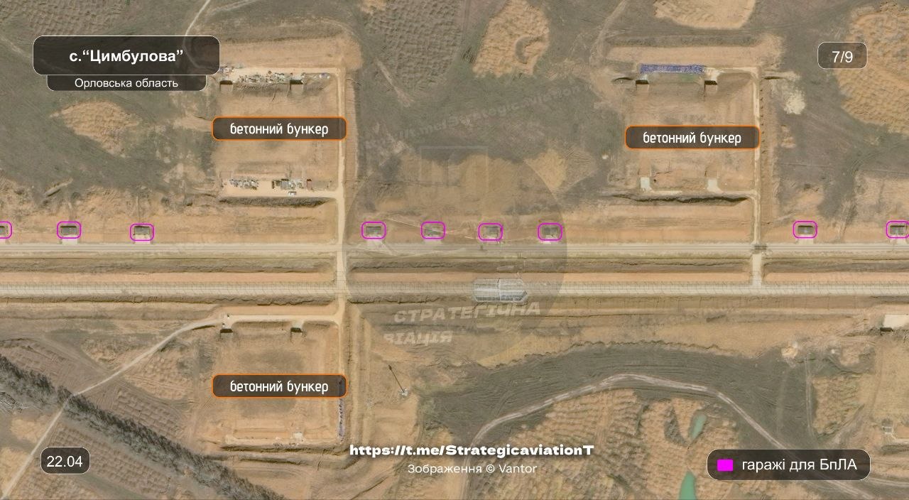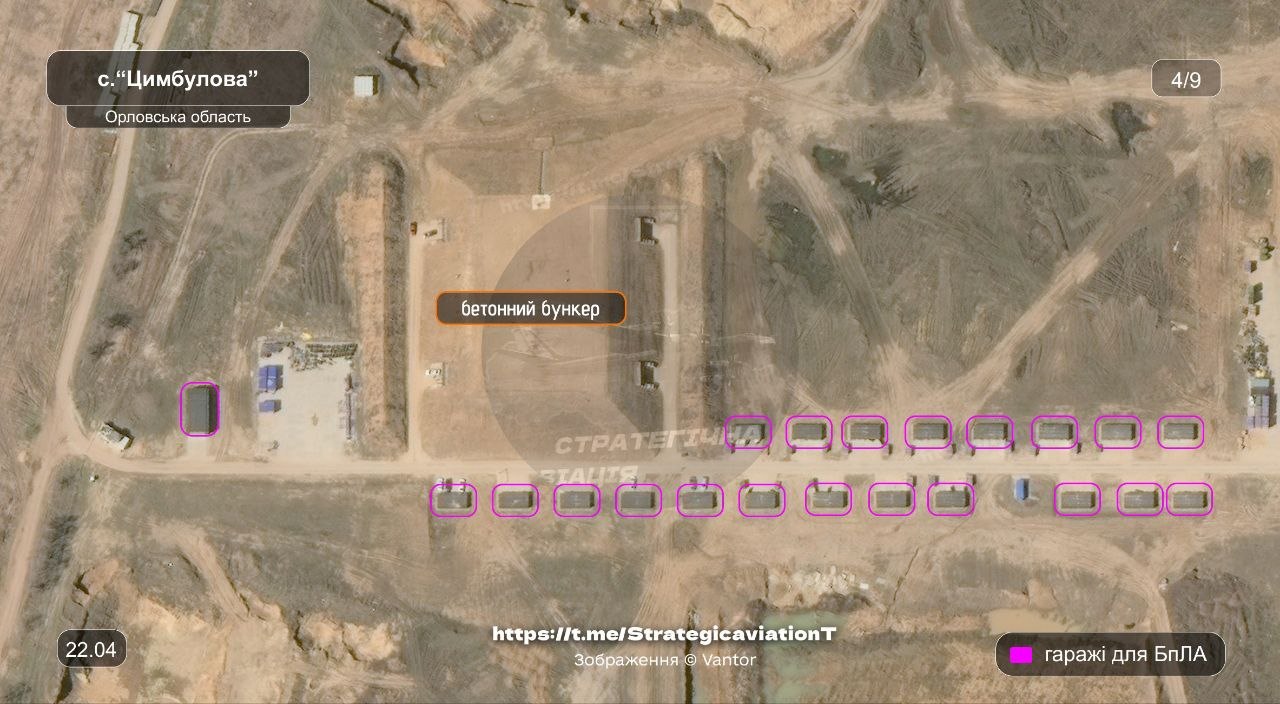 Говорится, что "Цимбулово" вместе с Донецким дронопортом являются единственными площадками для запуска реактивных БПЛА, На данный момент здесь продолжается строительство - идет расширение инфраструктуры и появляются новые "гаражи" для хранения беспилотников вместе с бункерами.