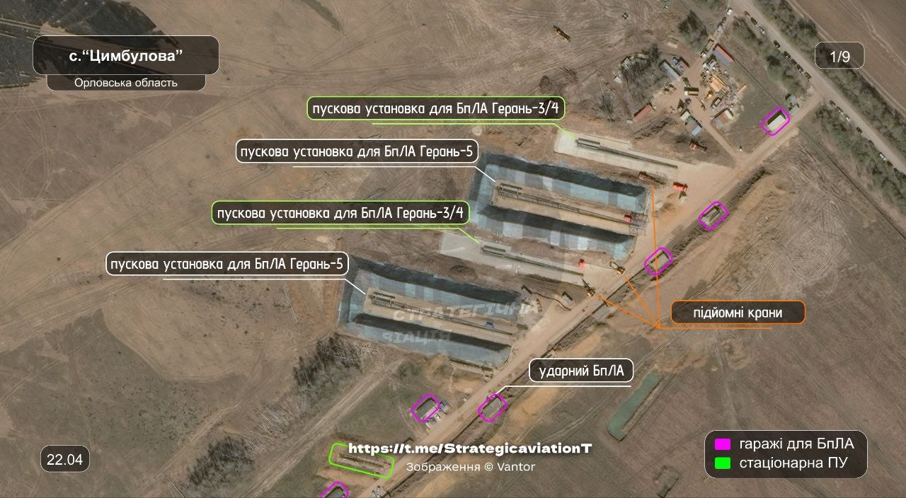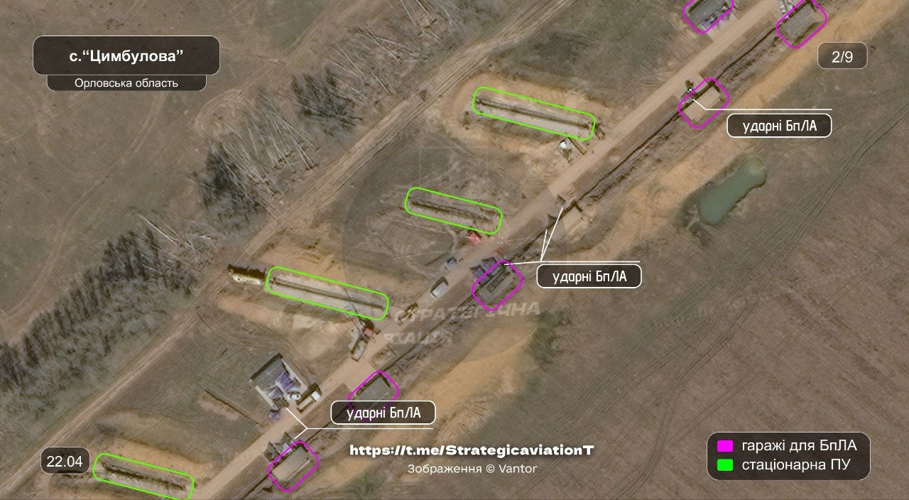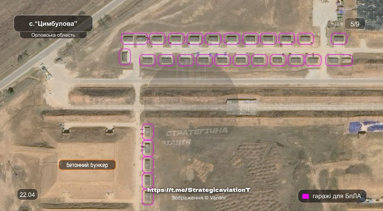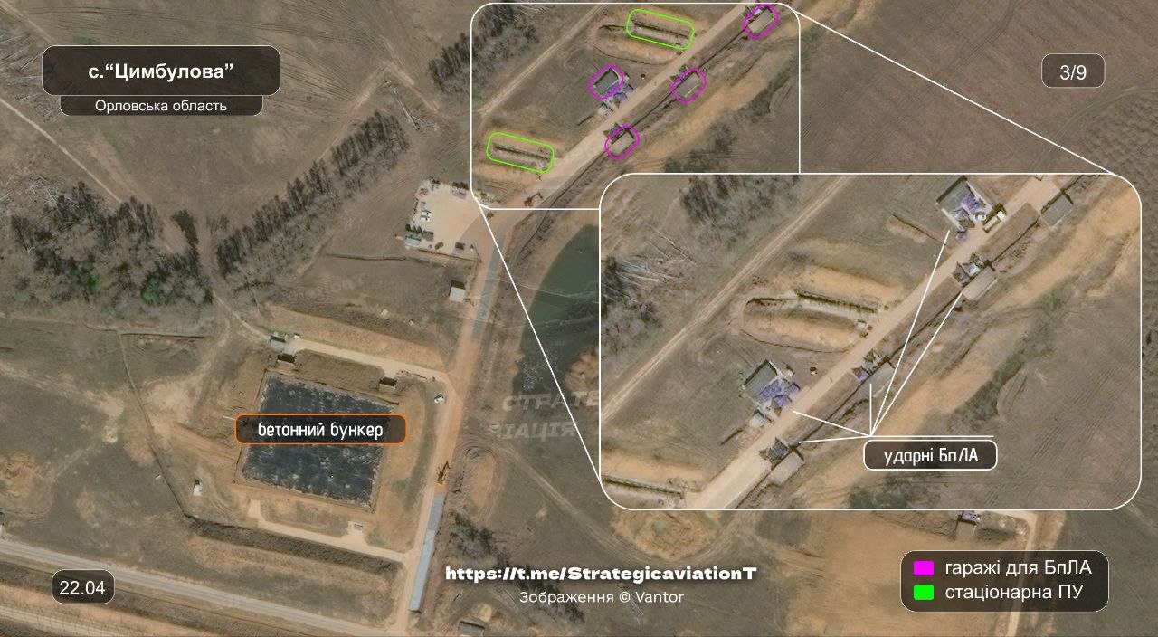 Говорится, что "Цимбулово" вместе с Донецким дронопортом являются единственными площадками для запуска реактивных БПЛА, На данный момент здесь продолжается строительство - идет расширение инфраструктуры и появляются новые "гаражи" для хранения беспилотников вместе с бункерами.