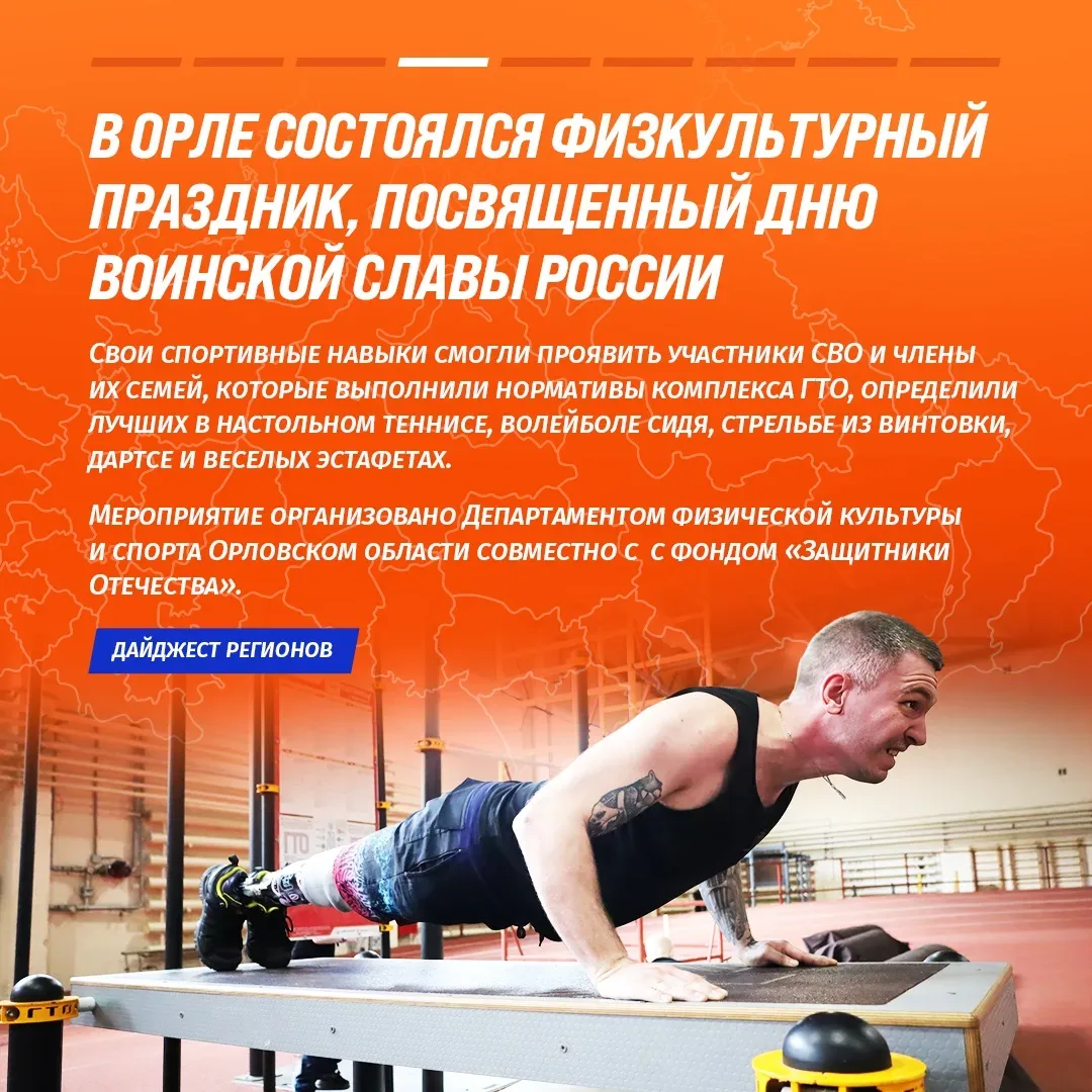 Наш регион отличился физкультурным праздником, посвященным Дню воинской славы России. Свои спортнавыки здесь показали участники СВО и члены их семей, которые выполнили нормативы комплекса ГТО, опредилили лучших в настольном теннисе, волейболе сидя, стрельбе из винтовки, дартсе и эстафетах.