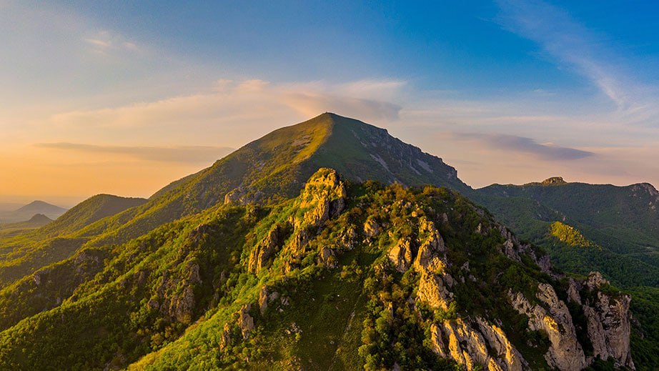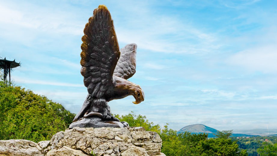 На лицевой стороне лидером пока стала скульптура орла, терзающего змею, на горе Горячей в Пятигорске (фото 2). Это символ торжества сил, здоровья и долголетия над болезнями и недугами. Почти так же много голосов получила гора Бештау (фото 3) с пятью вершинами.
