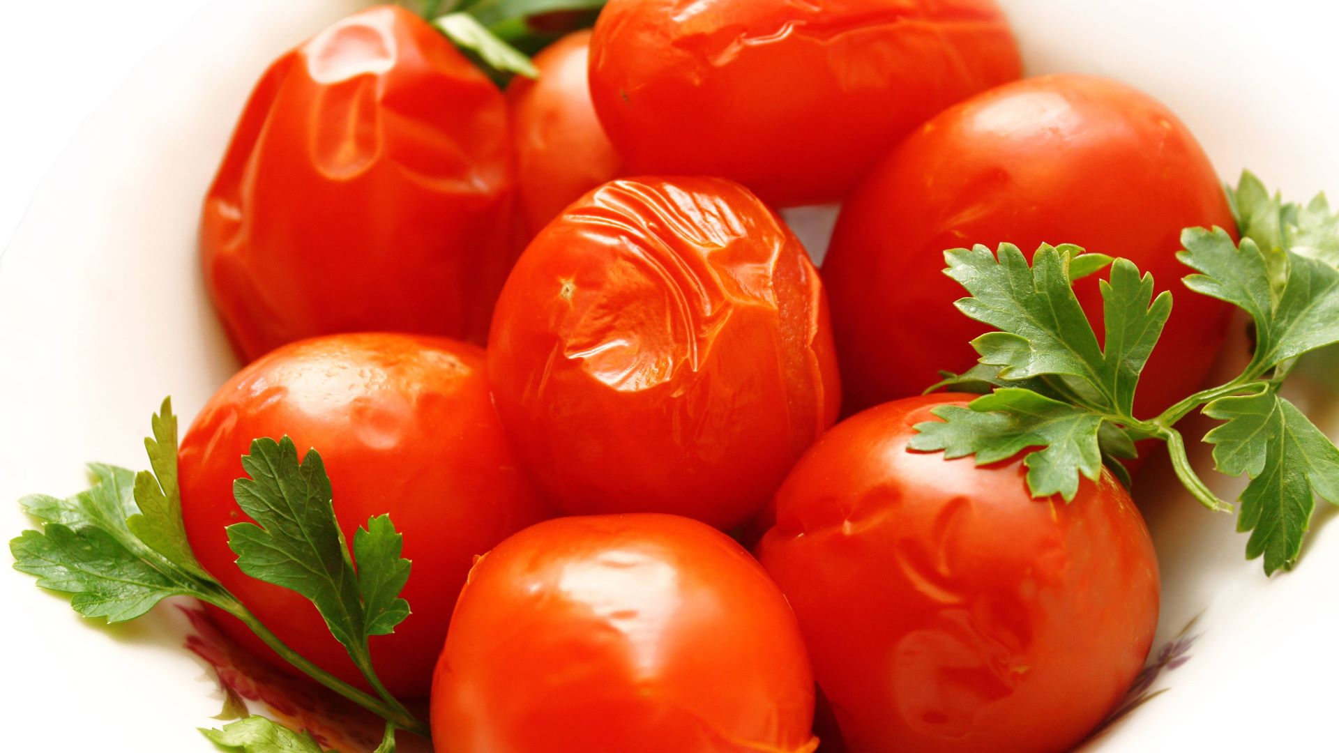 Вымытые и обсушенные томаты проткните зубочисткой в области плодоножки. Это нужно сделать, чтобы они не лопнули. На дно стерилизованной банки выложите перец и рваную ботву. Следом поместите помидоры.