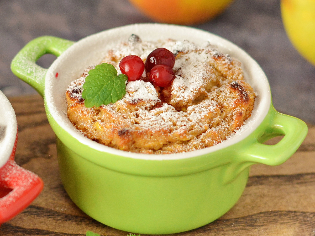 Данный десерт можно подавать как горячим, так и остывшим. Его вкус сочетает в себе нотки пирога и пудинга, но при этом лишён тяжёлого теста и избытка масла. Для особого оформления можно присыпать сахарной пудрой или добавить ягоды. Калорийность всего лишь около 136 ккал на 100 г, что делает этот десерт отличным решением для тех, кто следит за фигурой.