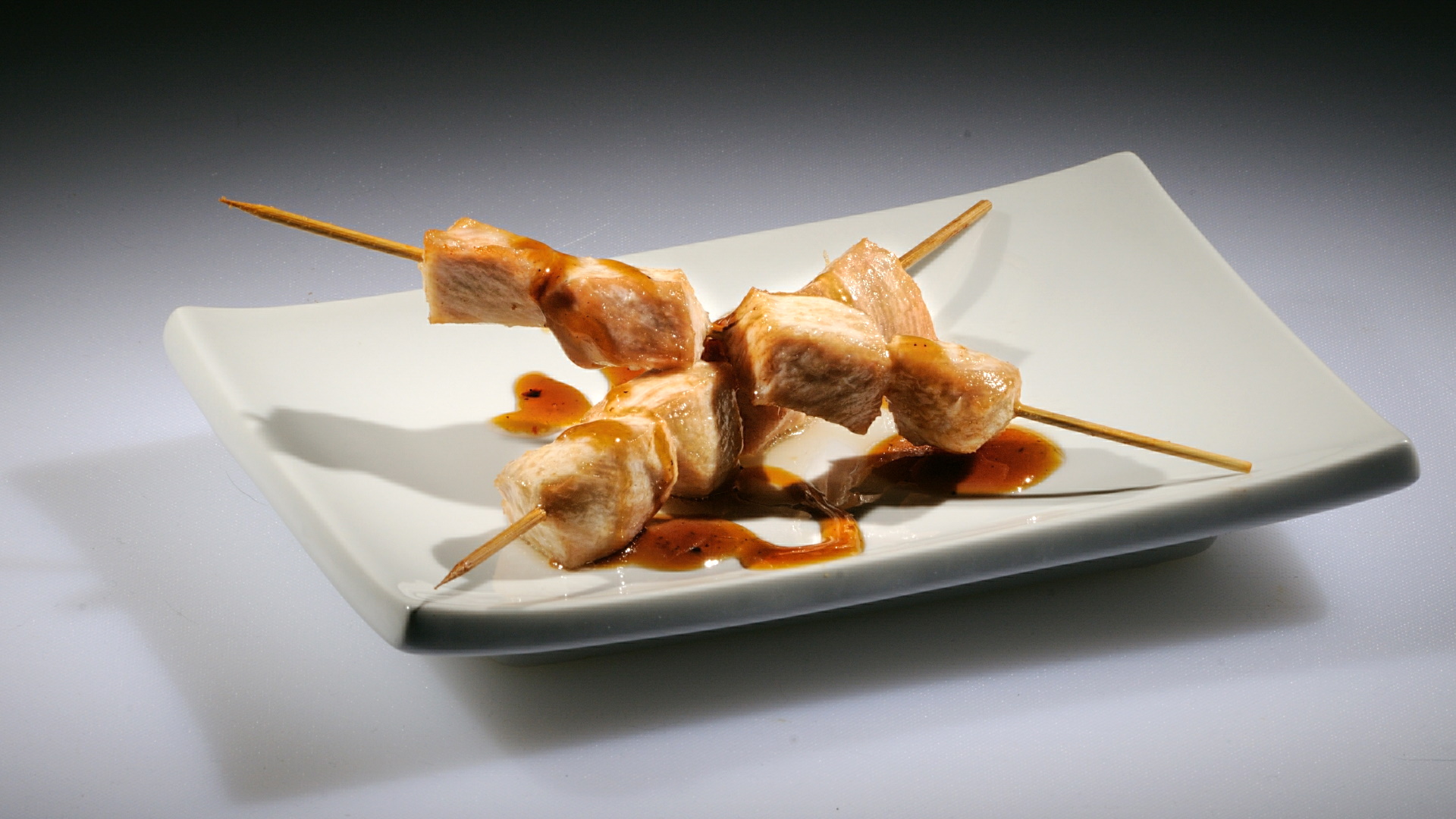 Кусочки курицы надевают на шпажки, чередуя со стеблями лука-шалот. Затем шашлычки обжаривают шесть минут на сильном огне, после чего смазывают соусом с двух сторон.
