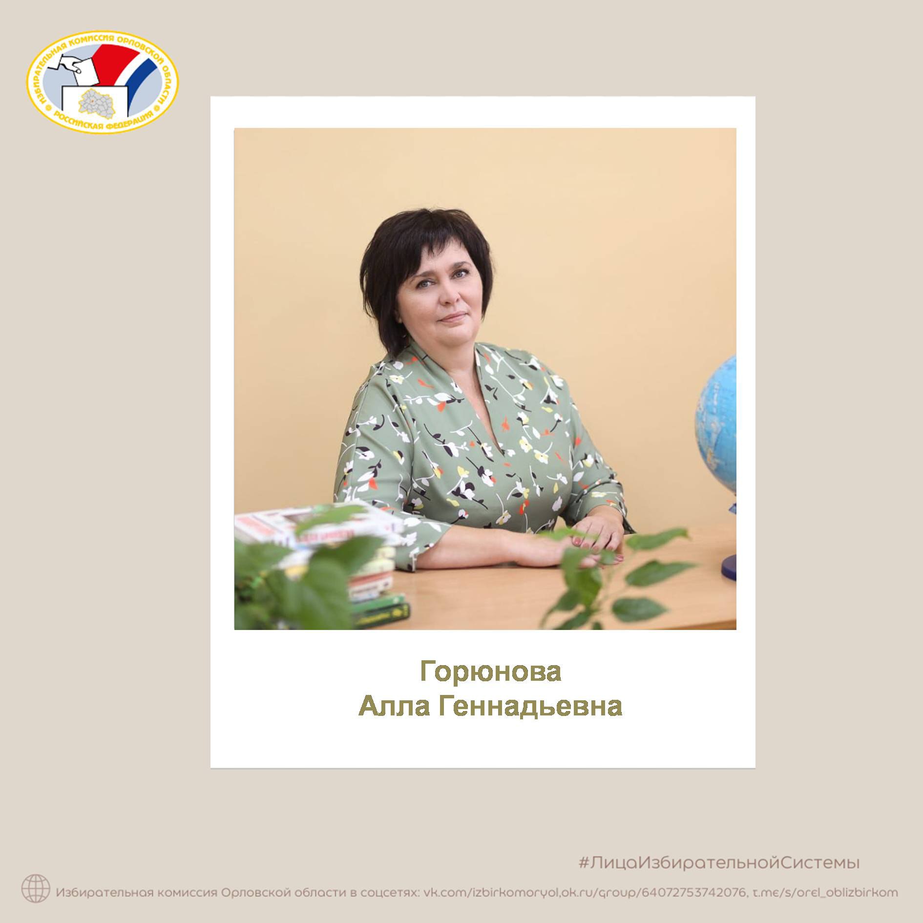 Среди педагогических работников - организаторов выборов Орловской области – Алла Геннадьевна Горюнова, директор муниципальной бюджетной средней общеобразовательной школы № 2 города Орла.