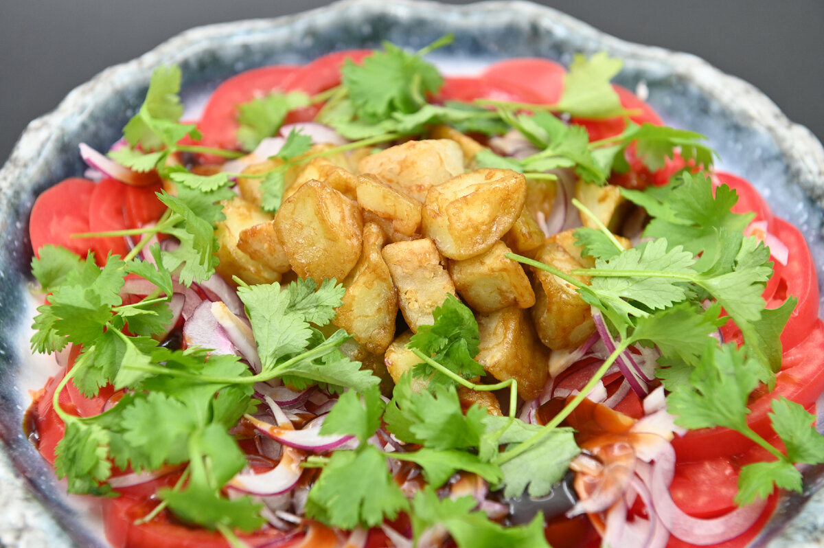 Готовые баклажаны выкладываются на бумажное полотенце, чтобы убрать лишнее масло, прежде чем соединить их с соусом терияки. В центре тарелки можно разместить баклажаны, чтобы они оставались хрустящими, а завершает подачу свежая кинза.