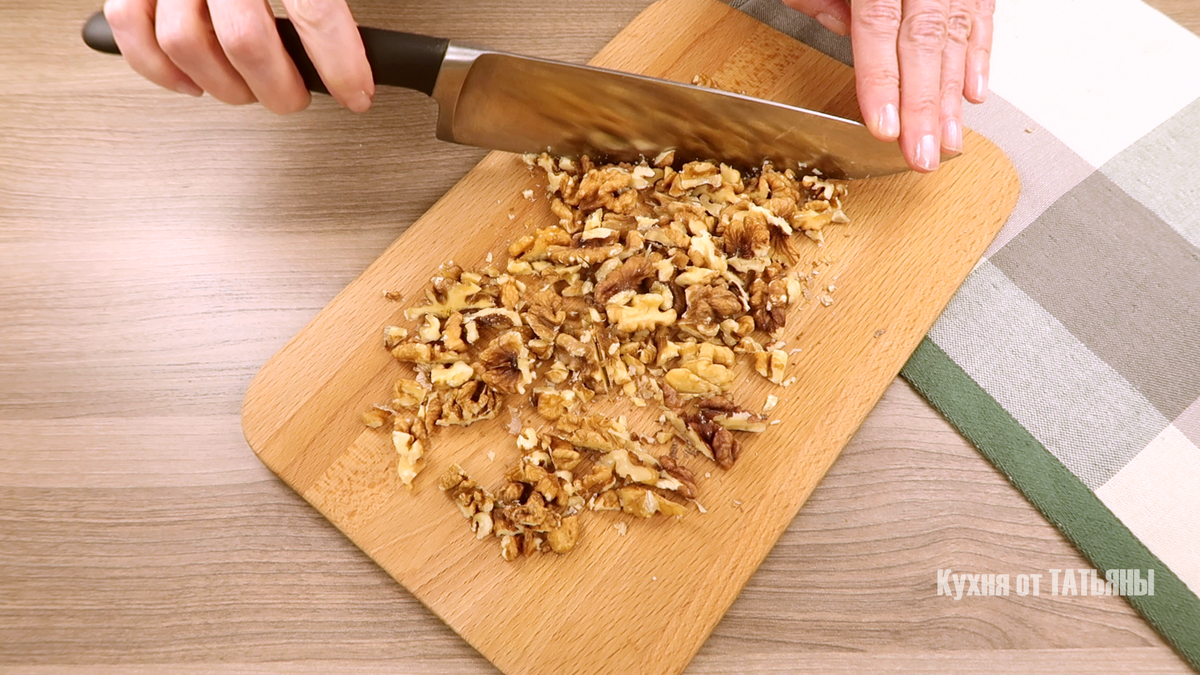 Для начала подготовьте грецкие орехи. К ним можно подойти креативно: порежьте их на небольшие кусочки или используйте кухонный комбайн, чтобы получить крупную крошку. Главное — не переборщить с размолом.