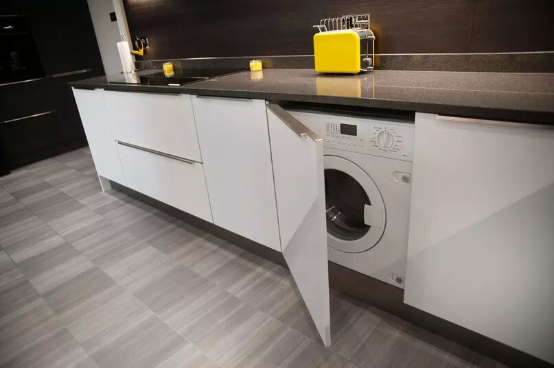 - Удобное подключение: На кухне уже имеются все необходимые коммуникации для стирки, что значительно упрощает установку. Часто нет необходимости в дополнительном монтаже, что экономит время и средства.