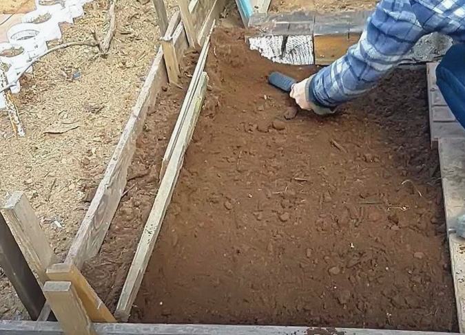 - Формирование коробки: По краям траншеи устанавливаются доски, укрепленные кольями. Это защитит почву от смыва.