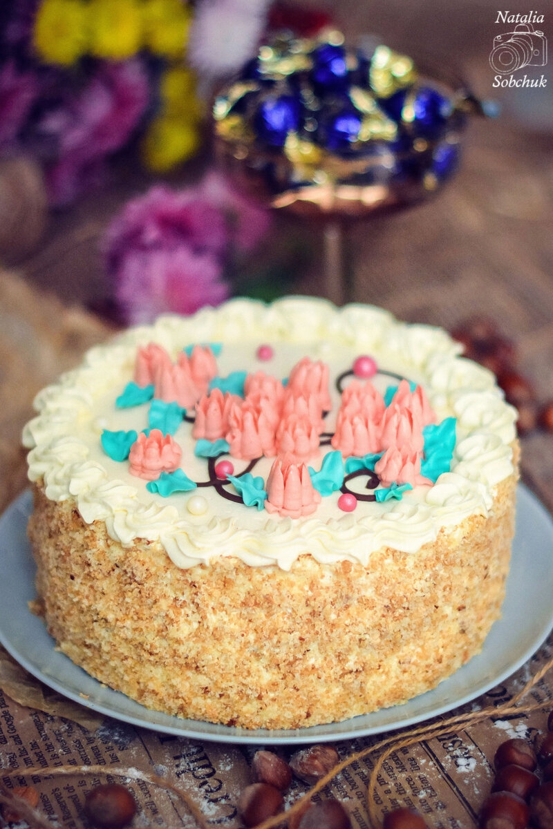 Внутри торта — легкие бисквитные коржи, которые гармонично сочетаются с хрустящей ореховой прослойкой из безе, кешью и фундука. Как изюминка — ароматный масляный крем с нотками коньяка. Это не просто торт, а настоящий гастрономический шедевр, который порадует каждого любителя сладкого.