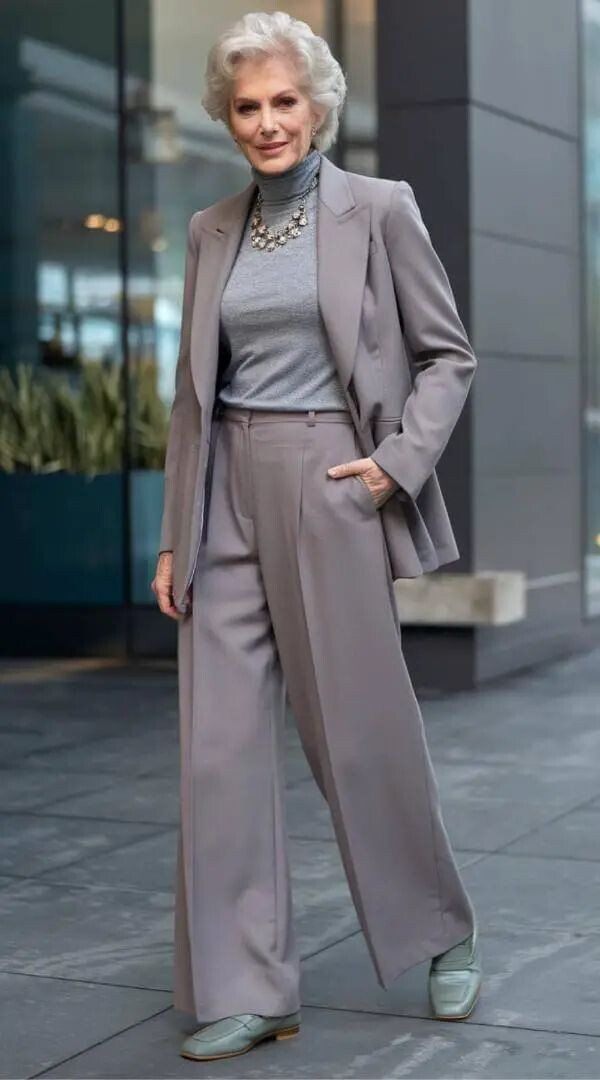 1. Сдержанная элегантность: Темно-серый костюм, включающий широкие брюки со стрелками и строгий жакет, в сочетании с жемчужно-серой водолазкой, создан для деловых встреч. Этот минималистичный комплект — идеальная базовая вещь для современного гардероба.