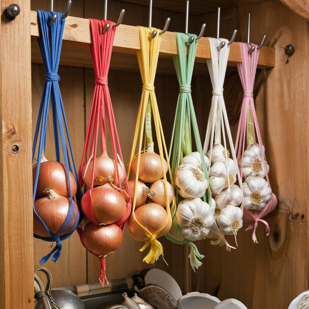 Капроновые колготки, благодаря своей структуре с микроскопическими отверстиями, позволяют воздуху свободно циркулировать, предотвращая образование влаги вокруг луковиц. Такая упаковка не только удерживает лук и чеснок в сухом состоянии, но и создает идеальные условия для долговременного хранения.