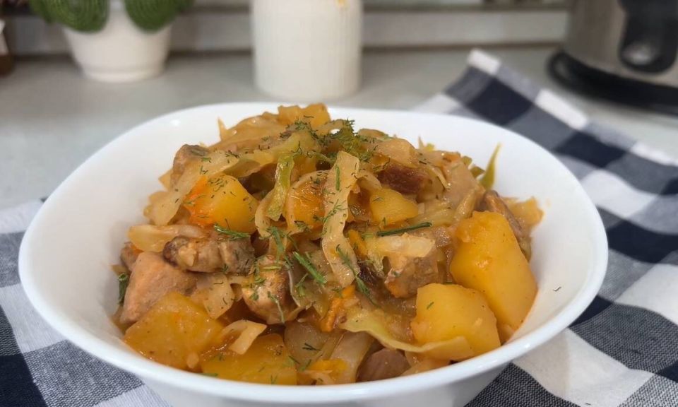 Добавить воду и томатную пасту, хорошо перемешать и готовить до мягкости капусты и картофеля.