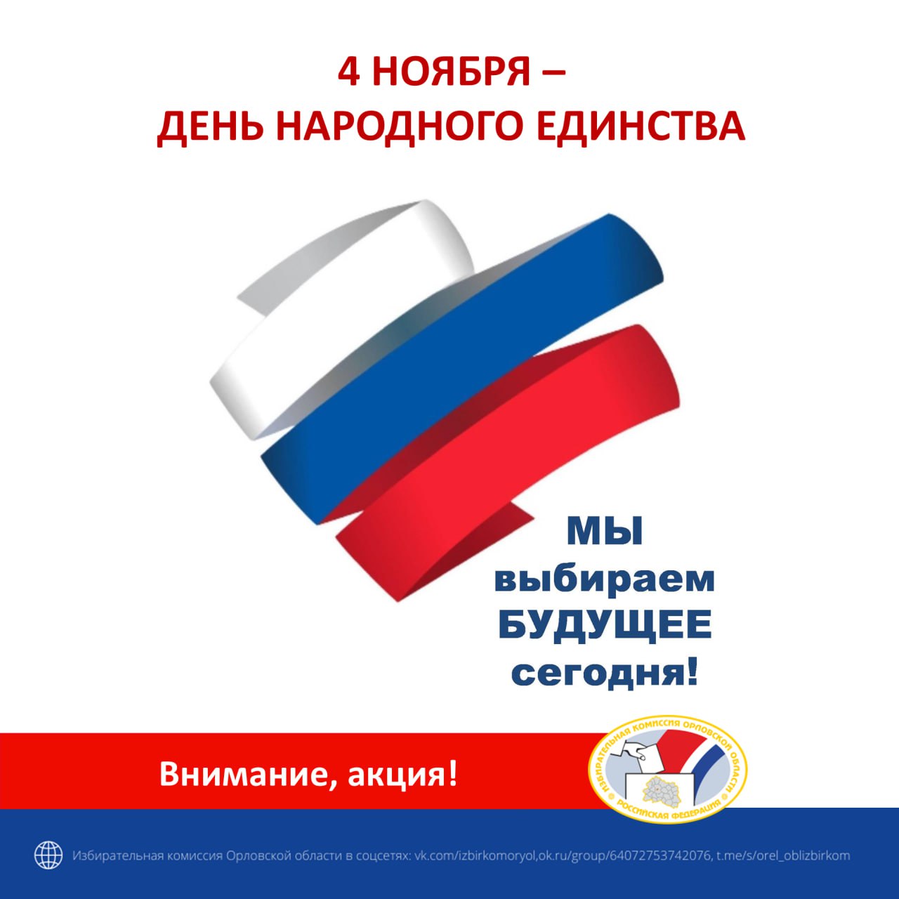 Ко Дню народного единства Избирательная комиссия Орловской области и территориальные избирательные комиссии Орла и Орловской области с 20 октября по 4 ноября 2025 года проводят акцию «Мы выбираем будущее сегодня!».