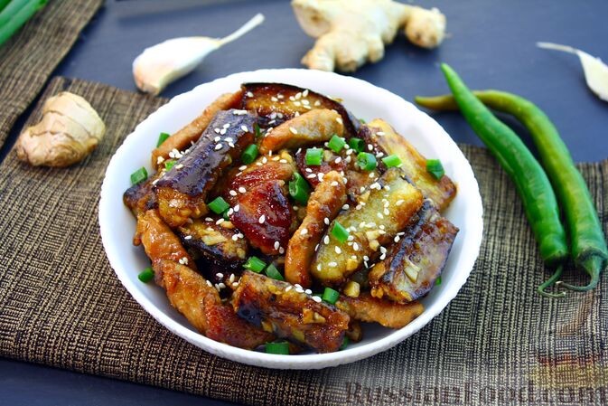 - Свинина с баклажанами по-китайски. Это блюдо выбивается на первый план благодаря харизматичному сочетанию имбиря, чеснока и соевого соуса. Такой дуэт создает бесконечное наслаждение для настоящих гурманов.