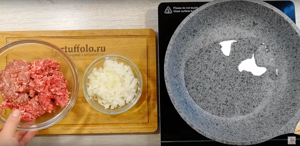 Рецепт начинается с подготовки мясной начинки. Используется смешанный фарш, состоящий из говядины и свинины, но и любой другой вариант подойдет. В глубокой сковороде с разогретым растительным маслом обжаривается мелко нарезанный лук до золотистого цвета. Это займет всего пару минут, сообщает Дзен-канал "Алена Митрофанова - рецепты.".