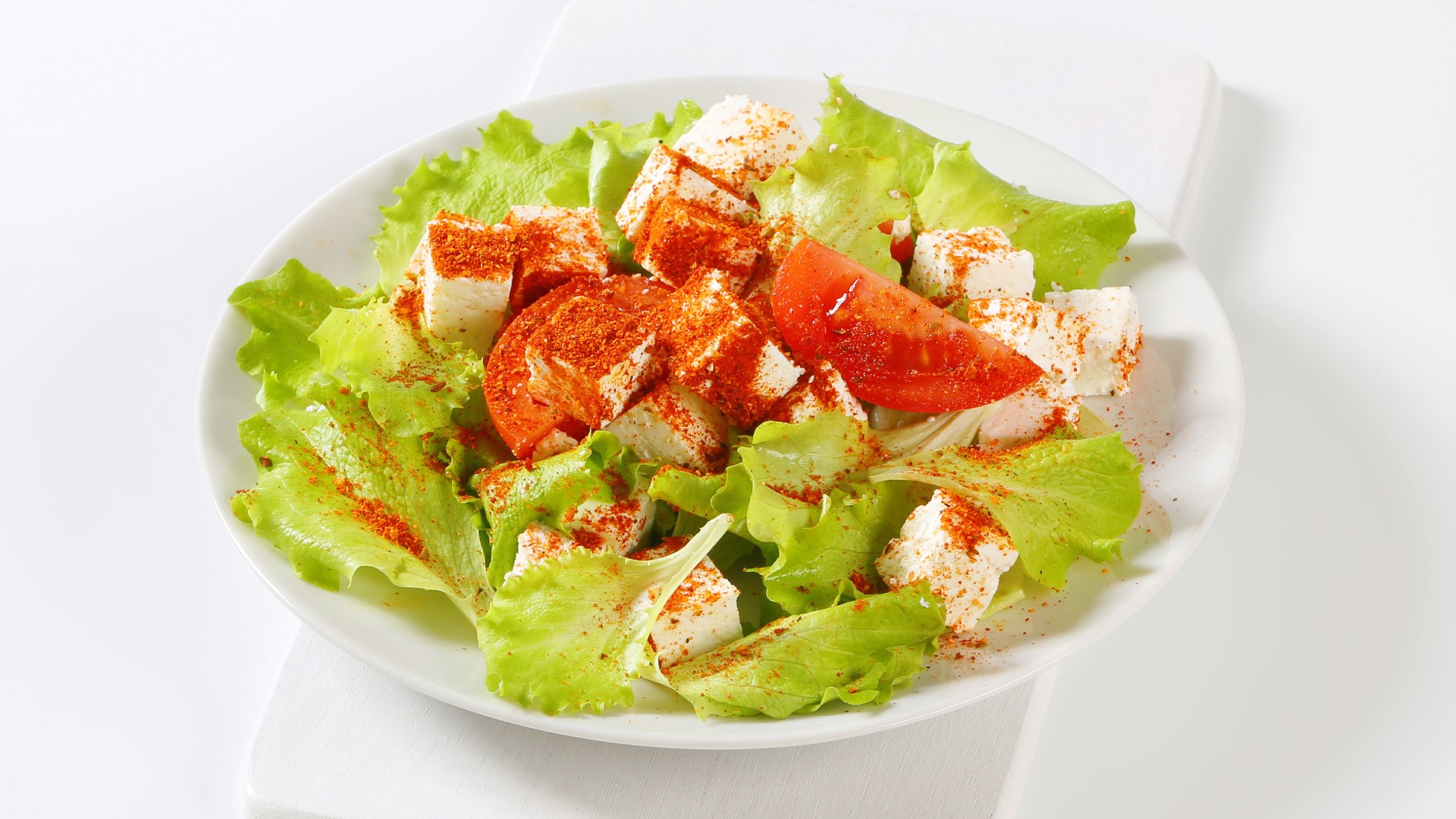 Томаты нарезаются крупными ломтиками, а колбасный сыр — кубиками. Зелень измельчается. Она может быть любая по вкусу: петрушка, укроп, базилик, кинза и т. д.