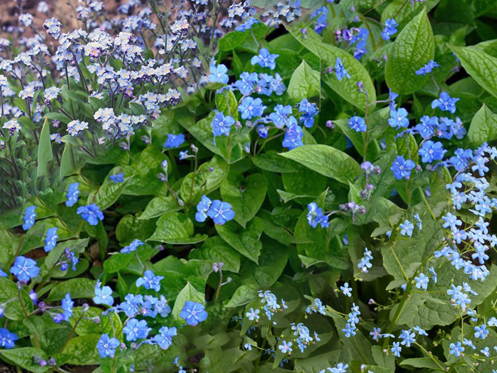 Бруннера — это выносливое многолетнее растение, которое часто встречается в садах. Ее объемные сердцевидные листья сохраняются зелеными до самой осени, а цветение происходит позже, чем у незабудок и пупочника, в конце мая или начале июня. Цветы собраны в рыхлые метелки и также напоминают незабудки, однако они отличаются своим неповторимым обаянием.