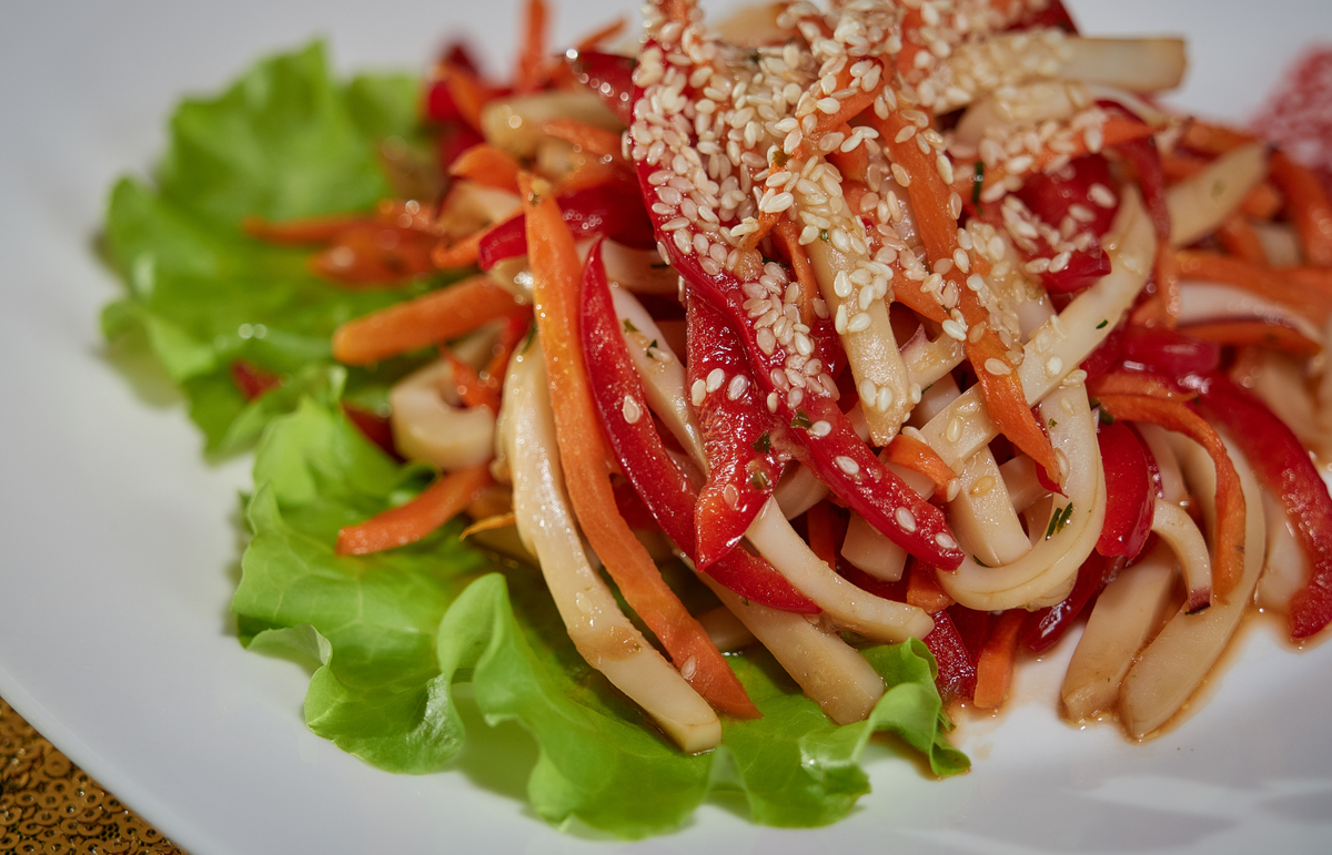 Заправка для салата состоит из соевого соуса, сахара, чеснока и уксуса — просто смешайте все до однородной массы. После этого в большой миске соедините кальмары, обжаренную морковь и сладкий перец. Заправьте салат приготовленным соусом и посыпьте поджаренными кунжутными семечками. Салат готов к подаче!