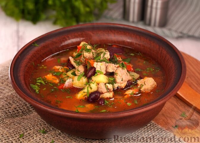 Этот наваристый суп станет отличным выбором для обеда. Для его приготовления понадобится свинина и консервированная фасоль. Мясо обжаривается с помидорами и сладким перцем, после чего в кастрюлю добавляют картофель, а все ингредиенты доводятся до полного готовности. В результате получается густой и сытный суп, который порадует всех.