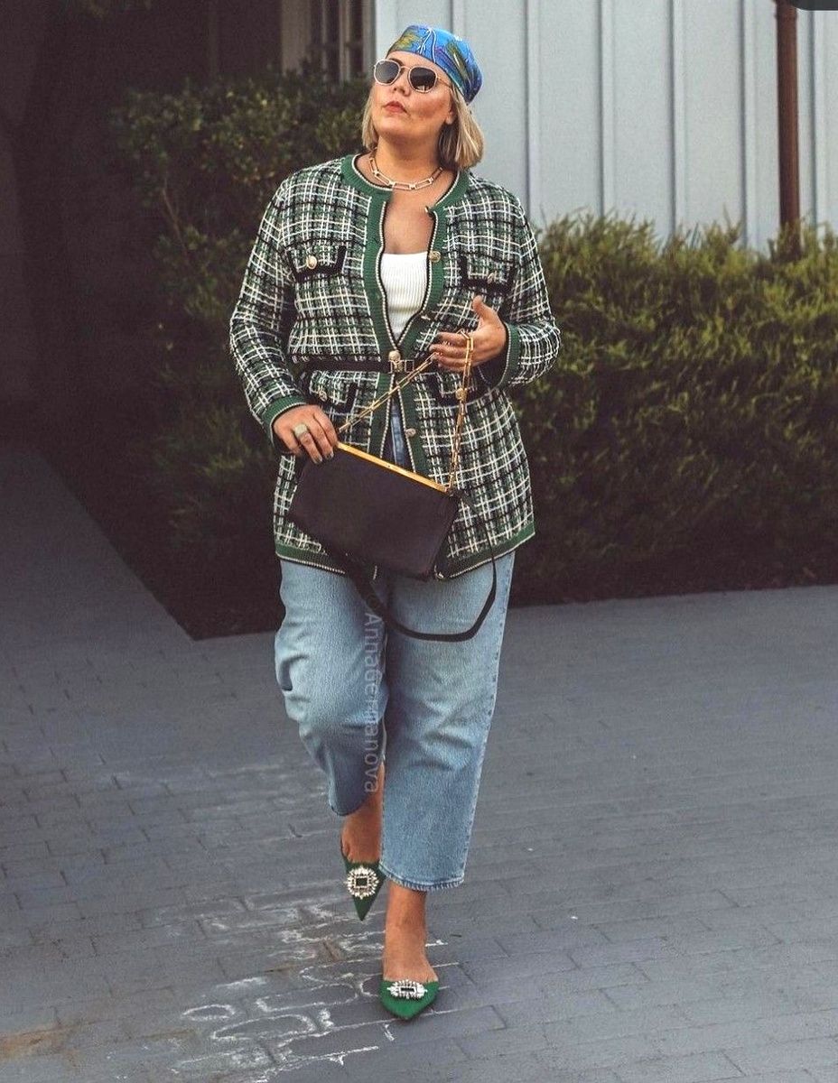 - Джинсовый шик: Прямые укороченные джинсы прекрасно сочетаются с белой базовой футболкой и твидовым кардиганом в клетку. Для создания акцента можно добавить тонкий пояс, а завершит образ остроноса обувь в изумрудном оттенке.
