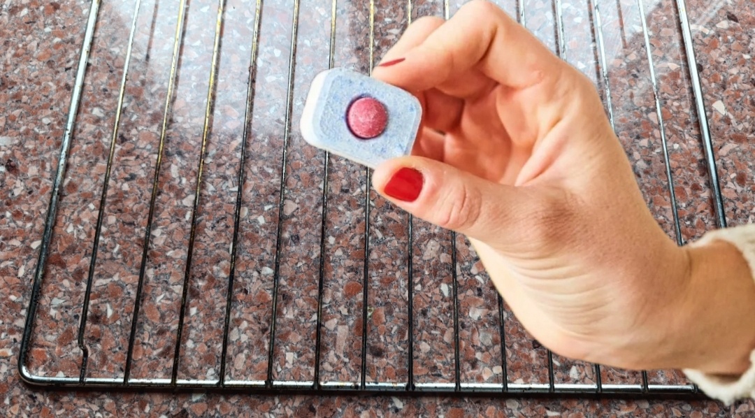 - Таблетка для посудомоечной машины: Оберните решетку фольгой и поместите в таз с горячей водой и таблеткой. Дайте постоять, а затем тщательно промойте.
