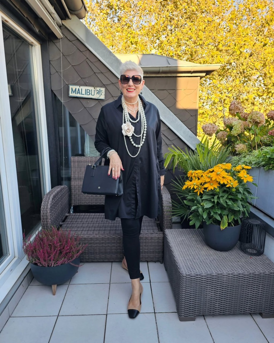Изящный черный шелковый ансамбль из леггинсов и удлиненной рубашки станет отличным выбором для зрелой женщины, чтобы продемонстрировать свой стиль. Завершить образ помогут легкие бежевые туфли с черными мысками, крупные солнечные очки и многослойное жемчужное украшение, добавляющее шарма.