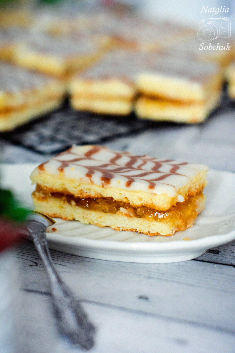 После выпекания коржи остудите на решетке. Один слой обильно намажьте джемом или повидлом, накройте вторым коржом и прижмите немного. Затем покрывайте верхний корж глазурью.