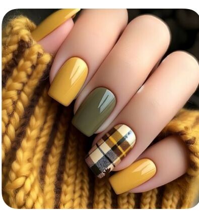- Приглушенные тональные сочетания: Теплые желтые и зеленые цвета идеально вписываются в осенний маникюр. Один из ногтей можно украсить рисунком в стиле«шотландки», что добавит оригинальности и привлечет внимание к рукам.
