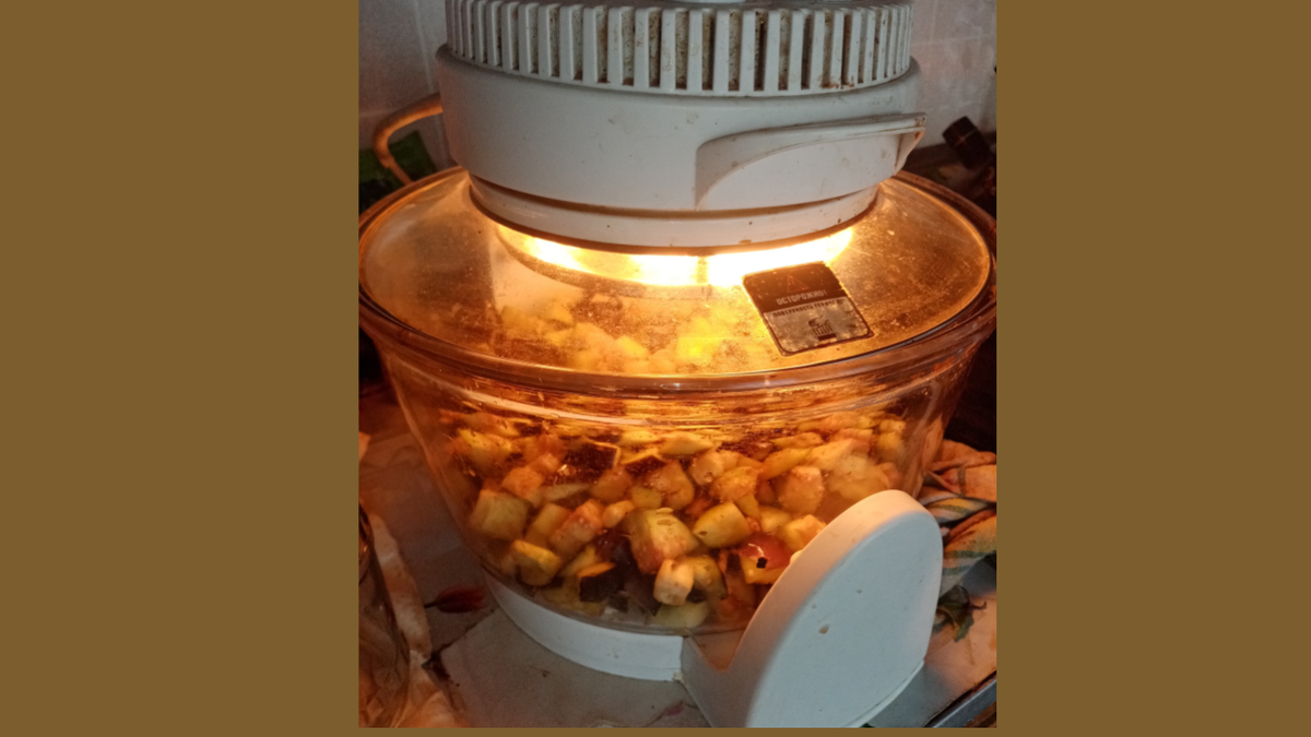 Для начала необходимо тщательно промыть все овощи, а затем нарезать баклажаны кубиками и немного присолить, оставив на 20 минут. После этого следует отжать лишний сок и поместить их в аэрогриль, установить температуру на 220-250 градусов и периодически перемешивать.