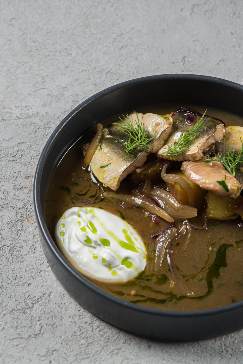 Когда основа готова, сверху помещают филе ряпушки, накрывают крышкой и оставляют томиться на среднем огне примерно на 4 минуты. После этого содержимое сковороды аккуратно накладывают на тарелку, украшают укропом и зелёным маслом, а также подают со сметаной.