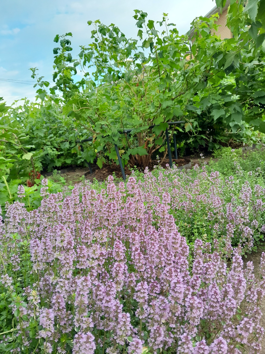 - Место расположения: томим на глухих участках сада, тимьян создает крепкий защитный щит для растений, таких как смородина и жимолость.