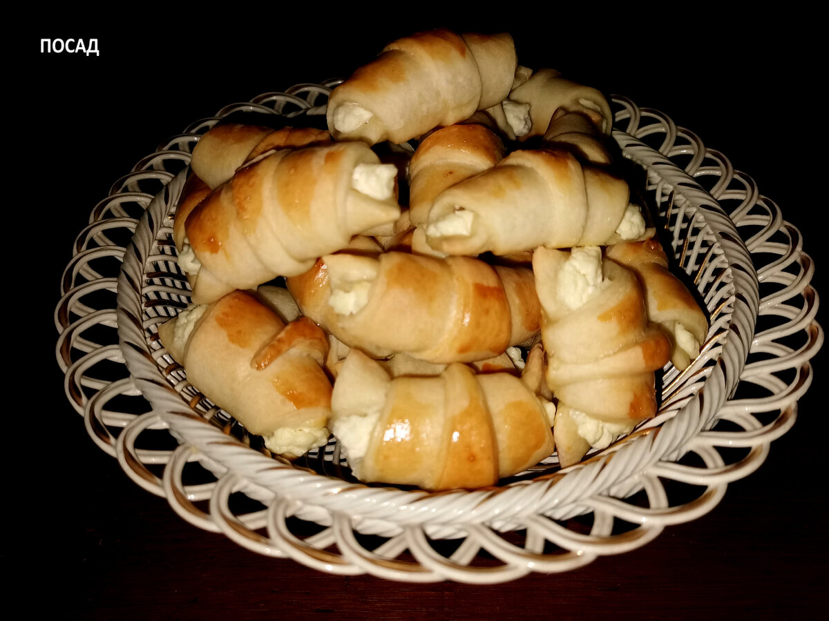 Тесто необходимо раскатать в круг толщиной около 3 мм, после чего нарезать на треугольники. Начинка из брынзы и яйца кладётся на края каждого сектора, а затем их нужно аккуратно свернуть в трубочку и уложить на противень. Выпекать в разогретой духовке при температуре 180 градусов 20 минут. Ориентироваться стоит на золотистую корочку — это признак готовности.