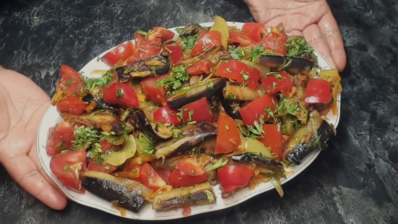 К последней части овощей добавьте лук. Готовьте его до прозрачности. Помидоры нарежьте кружками, а перец — соломкой. Выложите все овощи в глубокую емкость, сбрызните лимонным соком, посолите и поперчите. Перемешайте салат и посыпьте порубленной зеленью, советует портал «Аймкук».
