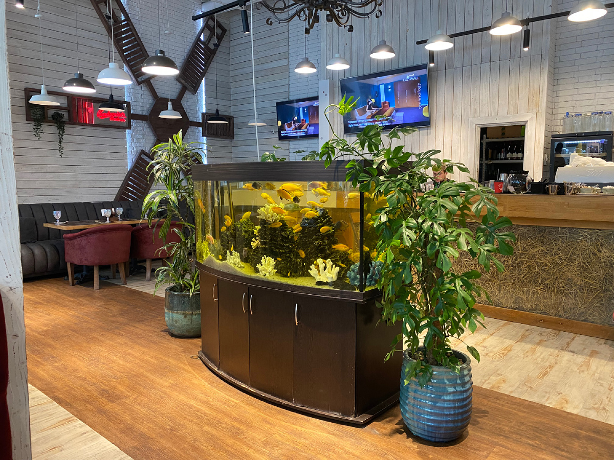 Интерьер ресторана создаёт атмосферу уюта: белые перекрытия, аквариум с золотыми рыбками и возвышенные столы. Вместе с тем, присутствует небольшое недоразумение: столы находятся на возвышенностях, и таблички на них напоминают посетителям следить за шагами. Это остается загадкой.