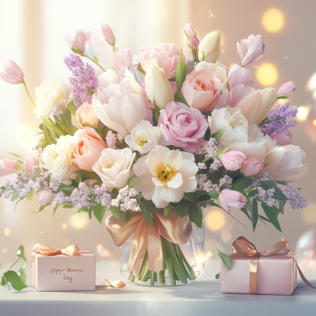 - Для мамы: идеально подойдут нежные розы пастельных оттенков, пионы или лилии, которые выражают заботу и любовь.