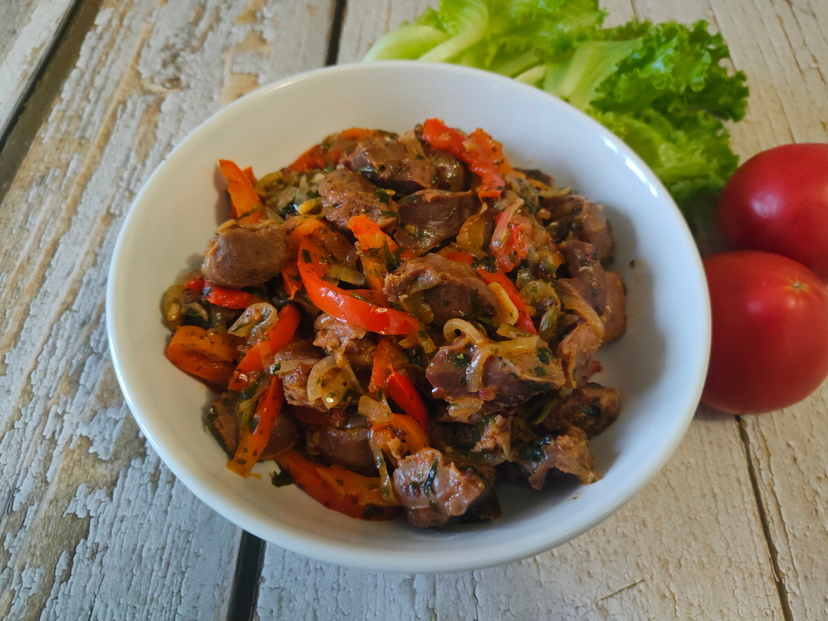 Как только желудки достигнут нужной консистенции, добавляются ранее нарезанные овощи и аджика. Дальше готовка продолжается, пока овощи не станут мягкими. В финале вводится зелень, которая завершит блюдо свойственным грузинским ароматом. Соль добавляется по вкусу, а уже готовое блюдо следует настоять под крышкой в течение 10 минут. Подавать рекомендуется с нейтральным гарниром, таким как мамалыга из кукурузной крупы, чтобы сбалансировать остроту.