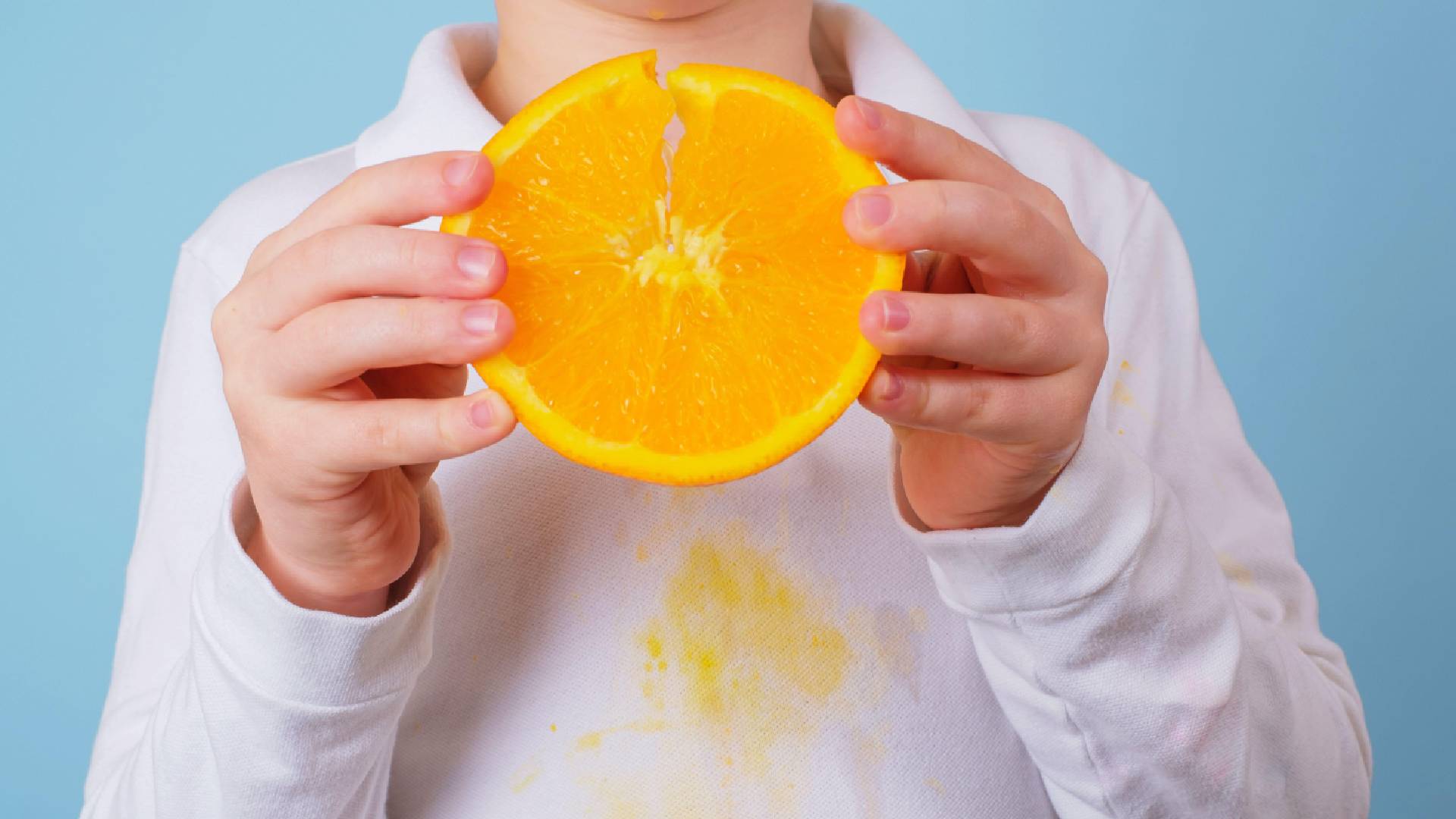 Яркие пятна от фруктового сока нужно обработать перекисью водорода и нашатырного спирта. Разведите их в пропорции 1:1 и нанесите на ткань ватным тампоном. Начинайте обработку от краев к центру. Затем сполосните загрязнение холодной водой и повторите процедуру. После этого постирайте вещь в машинке обычным способом.