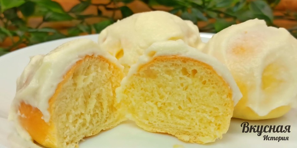 В качестве изюминки - пышный крем на основе сметаны, который сделает булочки ещё более аппетитными и поможет раскрыть их вкус: