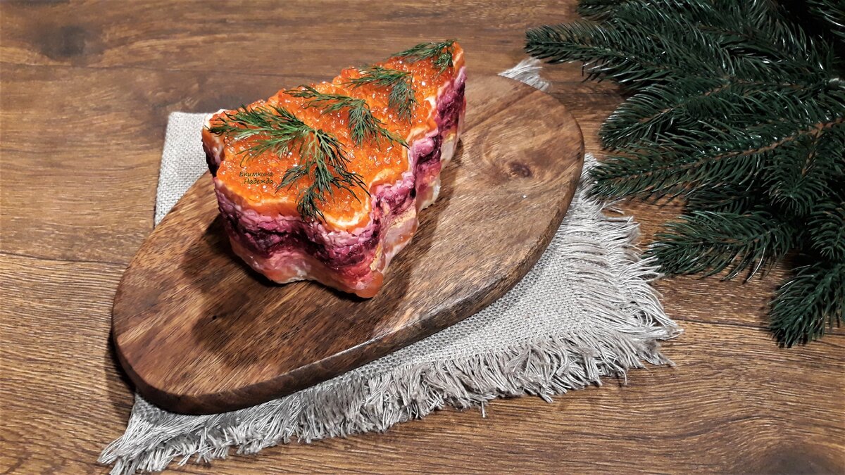 Каждый слой покрывается тонким слоем майонеза, и слегка присаливается. Важно помнить, что самый эффектный слой будет последний — это икра, которая укладывается в ряд, чтобы выглядеть аппетитно.