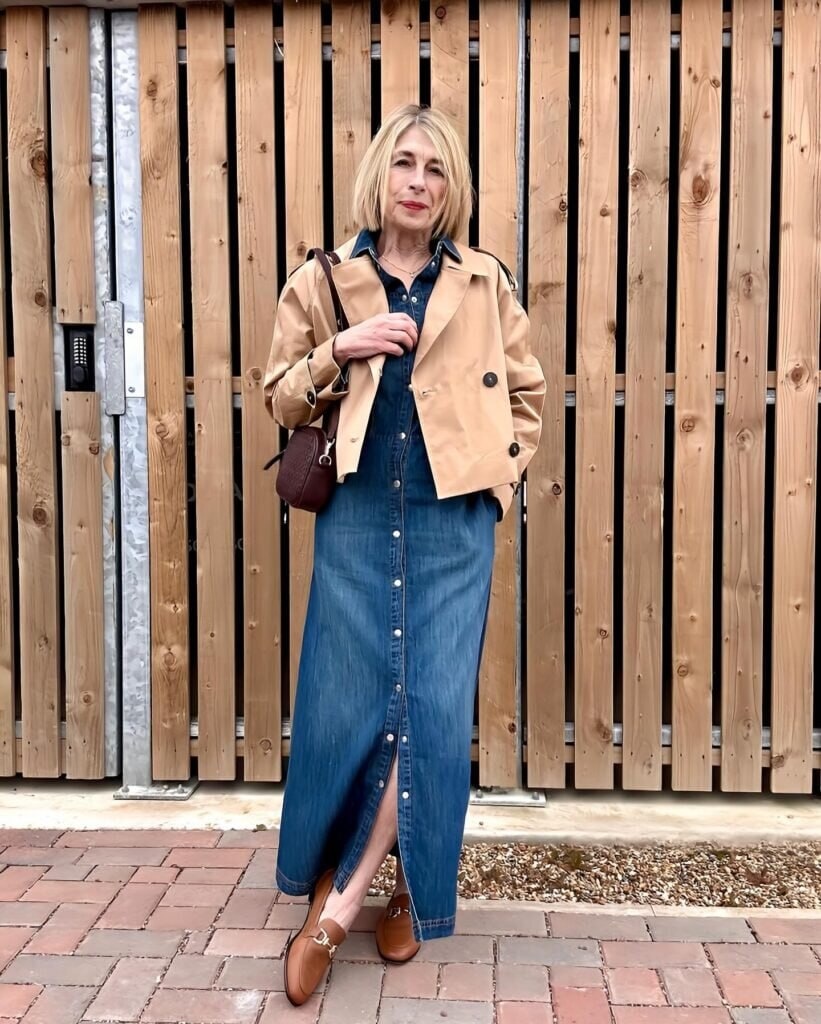 - Элегантное джинсовое платье: Спокойствие и легкость гарантирует макси-платье из джинсовой ткани с прямым кроем и застежкой на кнопки. Для создания уютного образа можно расстегнуть несколько кнопок и дополнить наряд бежевым укороченным плащом-тренчем. Завершит образ пара коричневых лоферов и удобная сумочка через плечо.