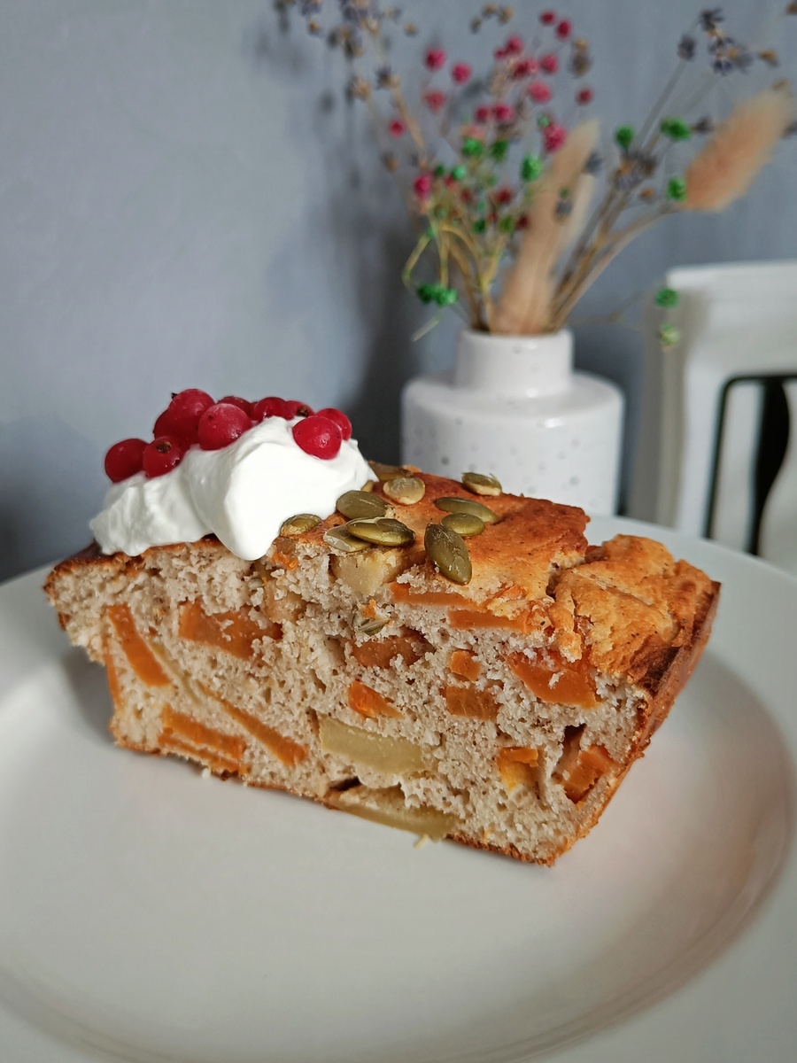 - Пирог с бататом и яблоком. Легкое и ароматное угощение, которое можно дополнить сметаной и красной смородиной для баланса вкусов.