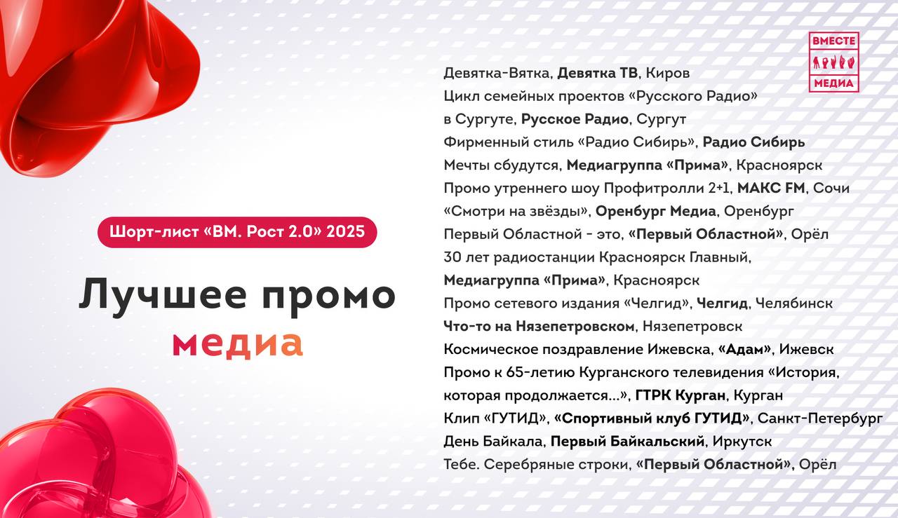 «Вместе медиа.Рост 2.0» - всероссийский конкурс, участвуют теле- и радиокомпании со всей страны. В номинацию "Лучшее промо медиа" мы предложили два своих проекта: проморолик "Первый Областной - это... " и спецпроект "Тебе. Серебряные строки". Обе наши работы - в шорт-листе конкурса!