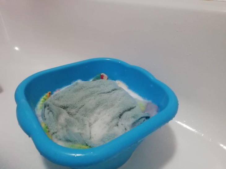 1. Берем таз с теплой водой и добавляем в воду 1 столовую ложку стирального порошка для ручной стирки.