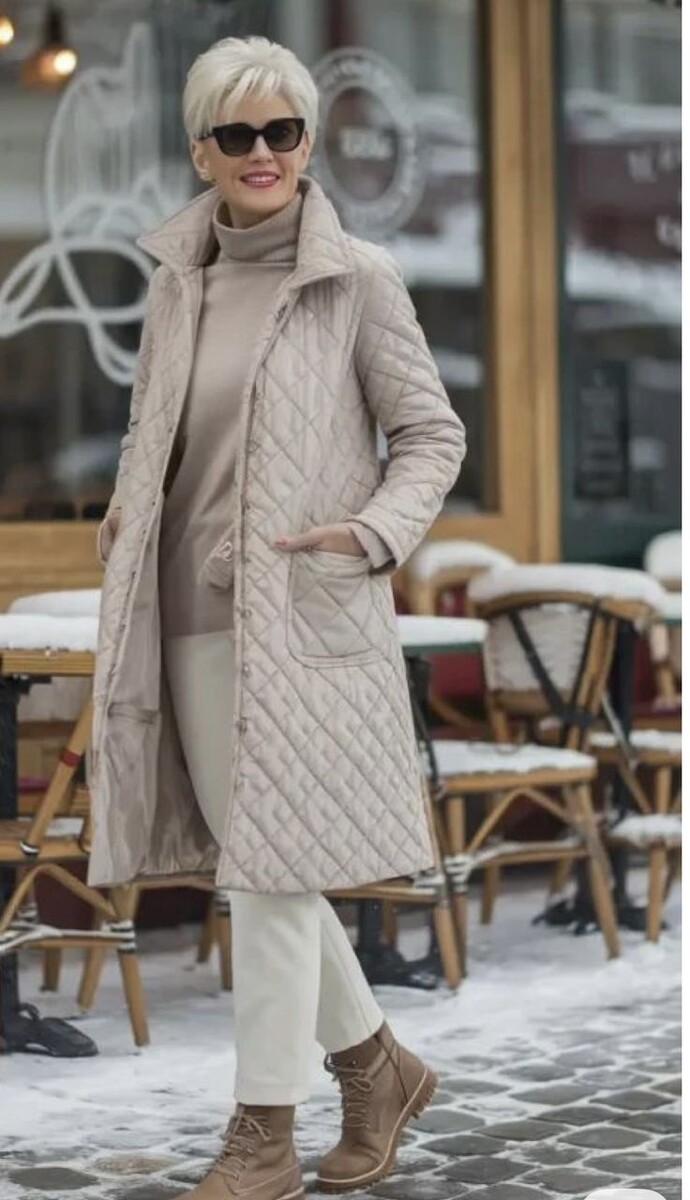 - Бежевый стеганый пуховик: Мягкая цветовая гамма создает гармонию, а универсальные ботинки добавляют утонченности в городской стиль. Такой образ подходит для женщин любого возраста и помогает подчеркнуть зрелую красоту.